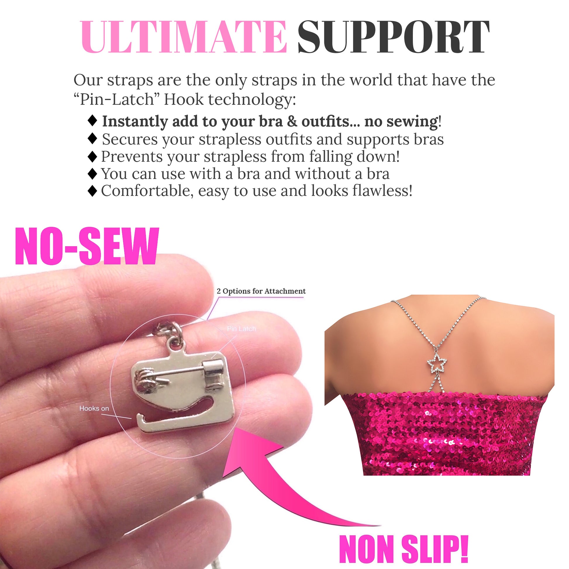 Unlike other straps, you can Hook On and Pin On instantly, discreetly, and securely to use with all your outfits without needing bra loops (no sewing), using our straps' one-of-a-kind "pin-latch" hooks.