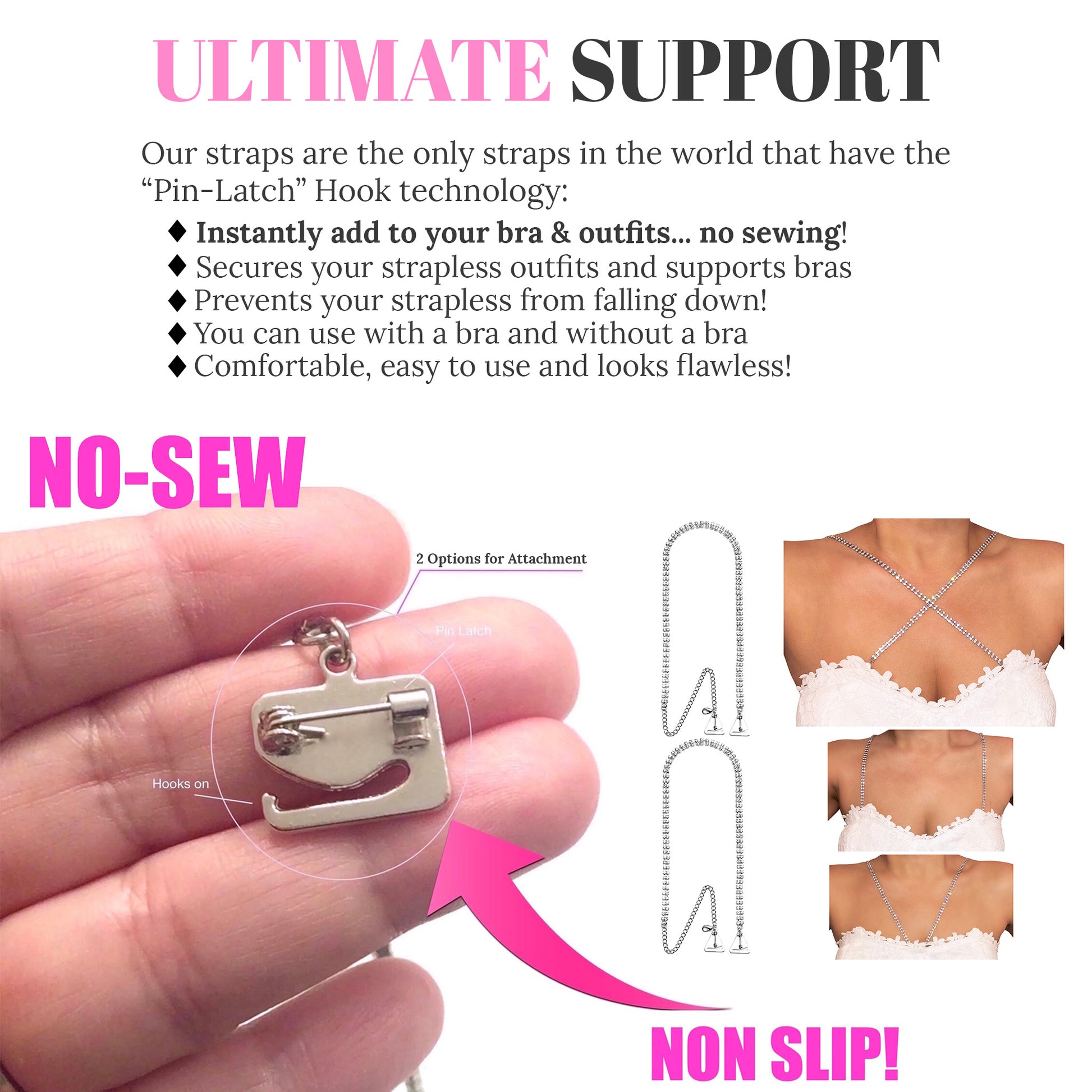 Unlike other straps, you can Hook On and Pin On instantly, discreetly, and securely to use with all your outfits without needing bra loops (no sewing), using our straps' one-of-a-kind "pin-latch" hooks.
