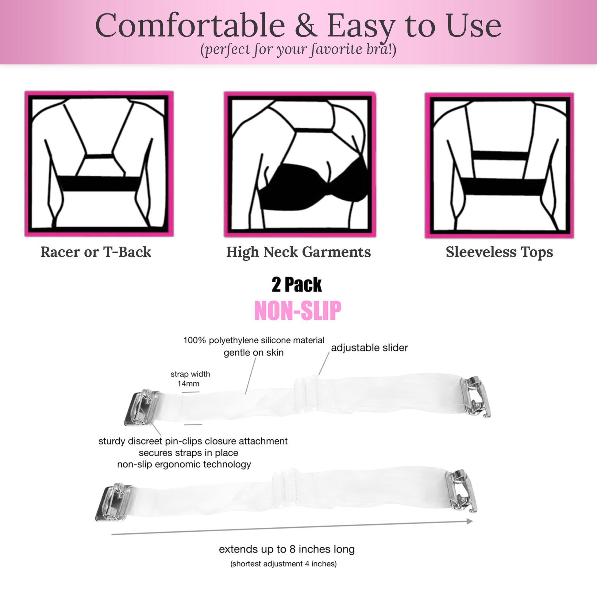 Get 2 (Non-Slip) Bra Strap Holders by Pin StrapsTM that truly won't slip, move, nor slide down, guaranteed!