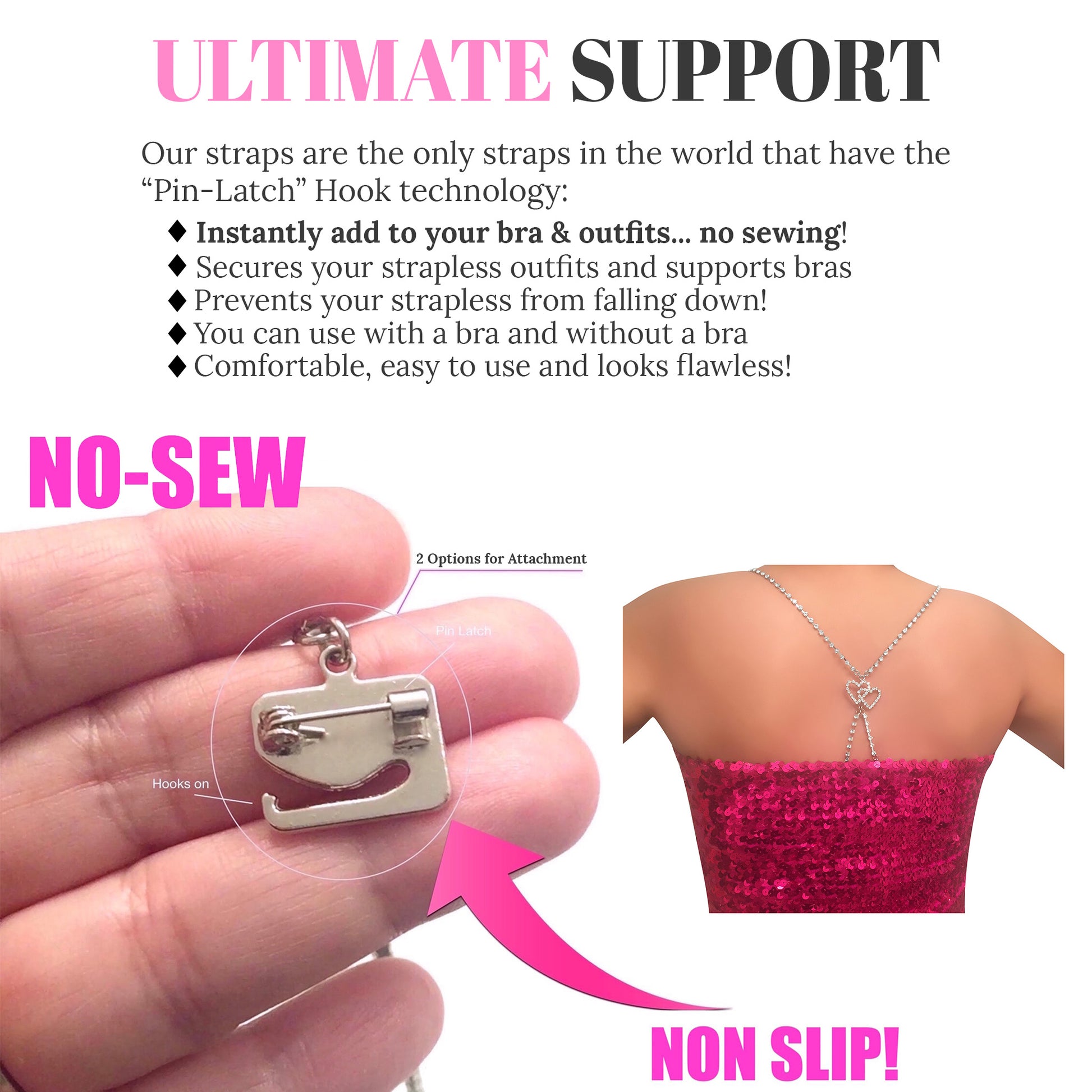 Unlike other straps, you can Hook On and Pin On instantly, discreetly, and securely to use with all your outfits without needing bra loops (no sewing), using our straps' one-of-a-kind "pin-latch" hooks.
