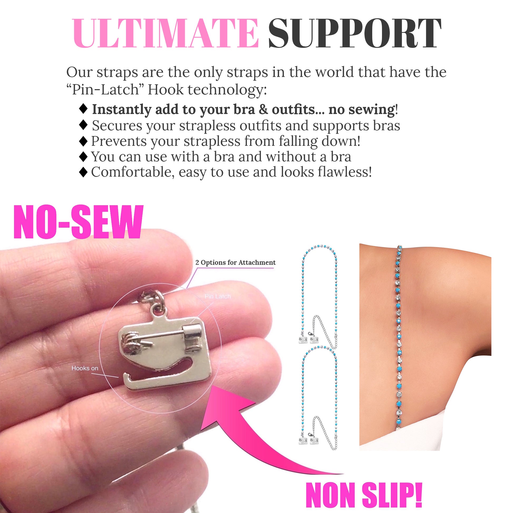 Unlike other straps, you can Hook On and Pin On instantly, discreetly, and securely to use with all your outfits without needing bra loops (no sewing), using our straps' one-of-a-kind "pin-latch" hooks.