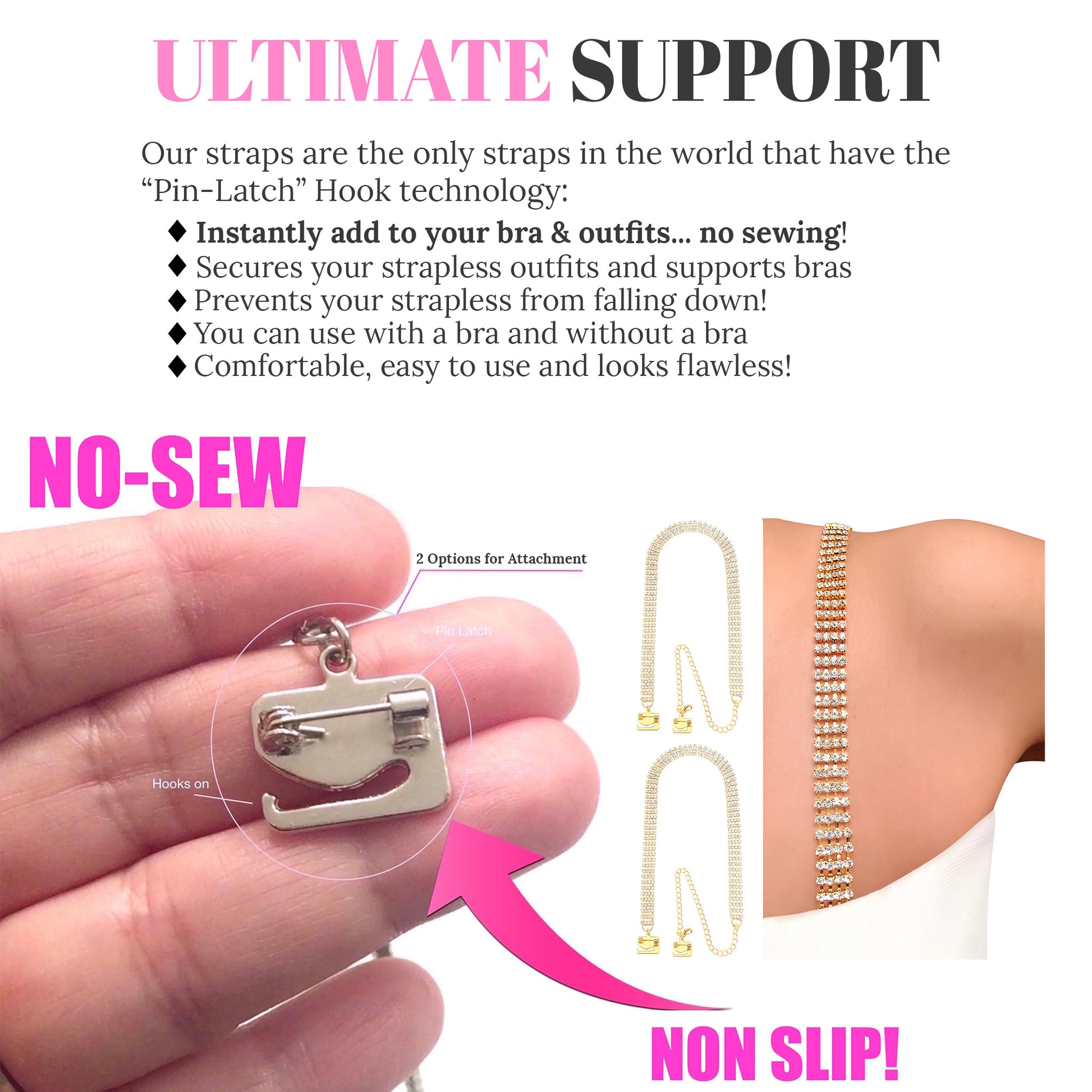 Unlike other straps, you can Hook On and Pin On instantly, discreetly, and securely to use with all your outfits without needing bra loops (no sewing), using our straps' one-of-a-kind "pin-latch" hooks.