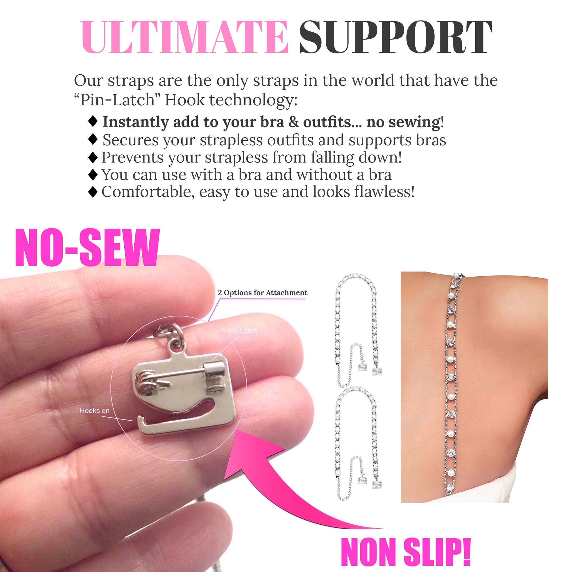 Unlike other straps, you can Hook On and Pin On instantly, discreetly, and securely to use with all your outfits without needing bra loops (no sewing), using our straps' one-of-a-kind "pin-latch" hooks.
